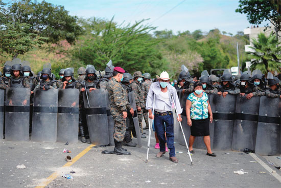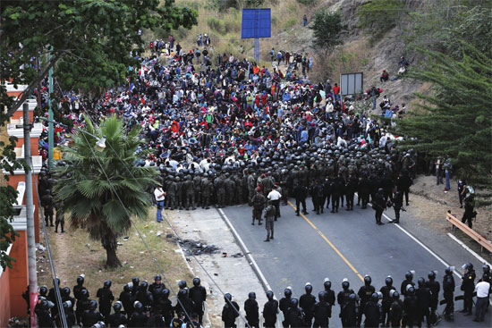 一队戴着头盔的士兵挥舞着盾牌和警棍,在危地马拉与洪都拉斯边界附近的高速公路上排成一列,试图阻止人们越过边境。想要越过边境的人源源不断,这条看似“坚固”的防线显得单薄而脆弱。