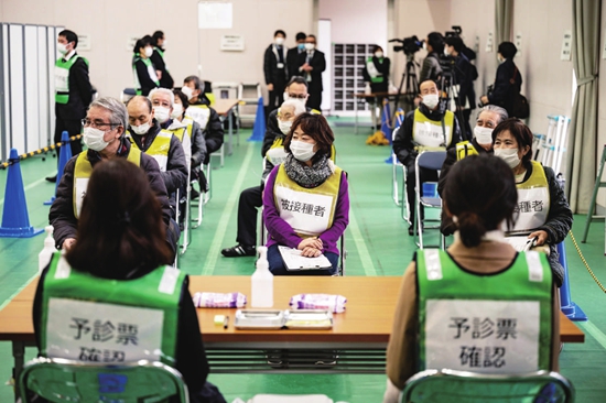 1月27日,日本川崎市开展新冠疫苗模拟接种演练,许多老年志愿者参加演练。该国将于2月底开始为医务工作者接种疫苗。图片来源 视觉中国