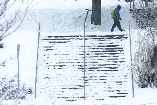 2月13日,美国华盛顿州西雅图的华盛顿大学,行人经过积雪的台阶。图片来源 新华社