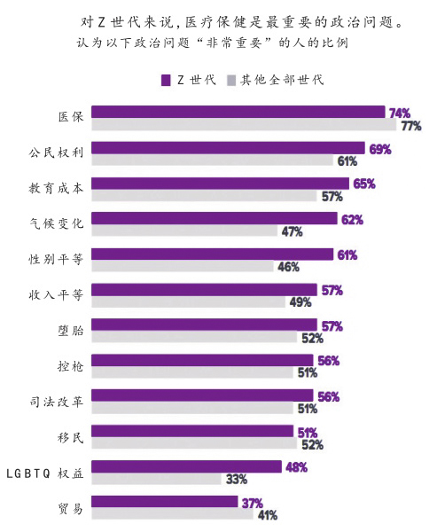 具体来说,78%的Z世代认为美国有很多腐败现象;只有8%的人“非常相信”掌权者通常会做正确的事,“比较相信”的人有34%;53%的人认为,在美国,努力工作、谨守规矩的人通常会取得成功,这个比例较此前的世代低了8个百分点。只有44%的人说他们有明确的政治观点,比此前的世代低20个百分点。只有8%的人表示他们非常关注政治,另有29%的人表示他们会在一定程度上关注。