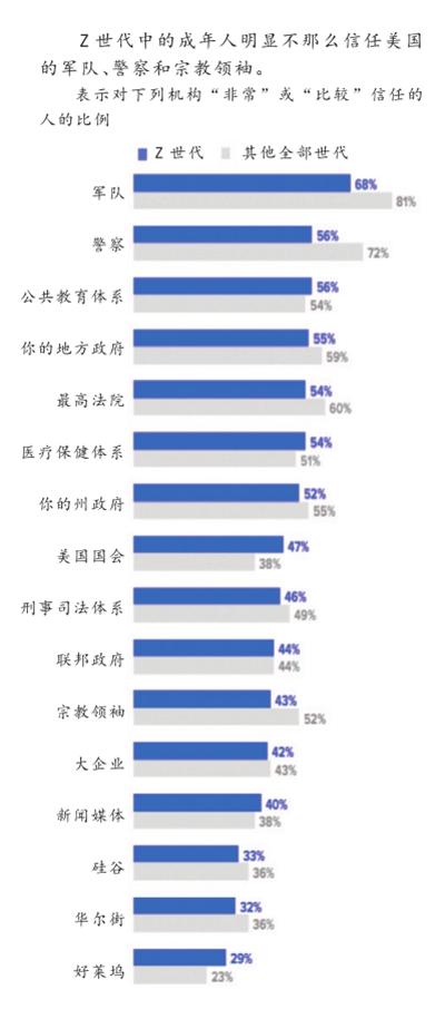 报告称,和大多数美国人一样,Z世代高度怀疑掌权者的行为是否负责任,以及重要机构是否值得信任。与老一辈相比,Z世代中的成年人对政治不那么关注,这一现象在年轻美国人中并不罕见。