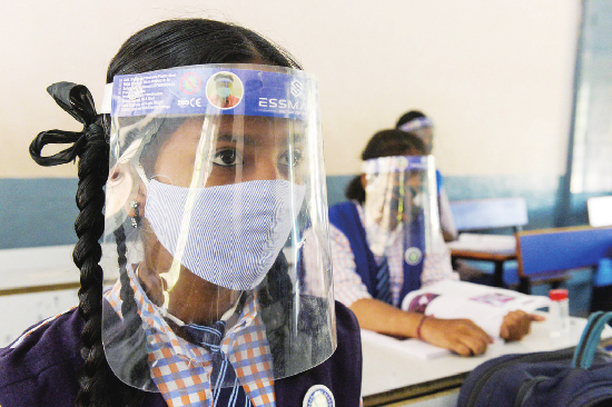 当地时间2月6日,印度海得拉巴的学校重新开学,学生戴着防护面罩和口罩上课。