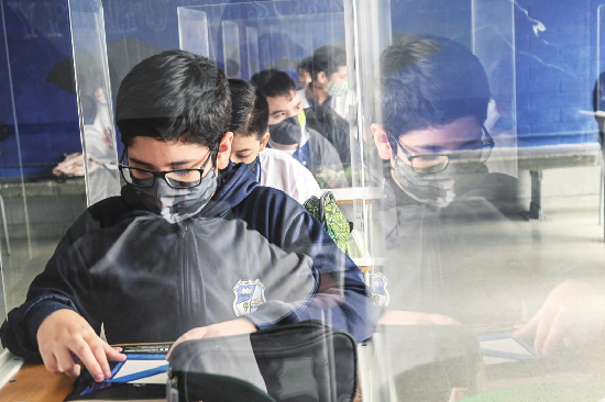 当地时间2月25日,哥伦比亚伊塔圭,学校在课桌间设置了透明挡板。