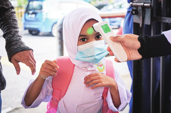 当地时间3月1日,马来西亚吉隆坡的部分学校重新开放,学生接受体温检测。