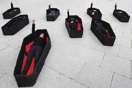 当地时间3月7日,以色列特拉维夫的一所法院外,一群女性在棺材中平躺,抗议家暴。