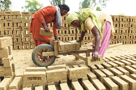 当地时间3月7日,印度阿姆利则,女性在砖窑里劳动。
