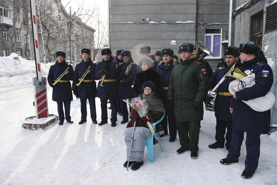 当地时间3月7日,俄罗斯新西伯利亚,俄罗斯中央军区军人为二战女兵娜塔莉娅·聂克拉索娃举行户外音乐会,迎接国际劳动妇女节到来。